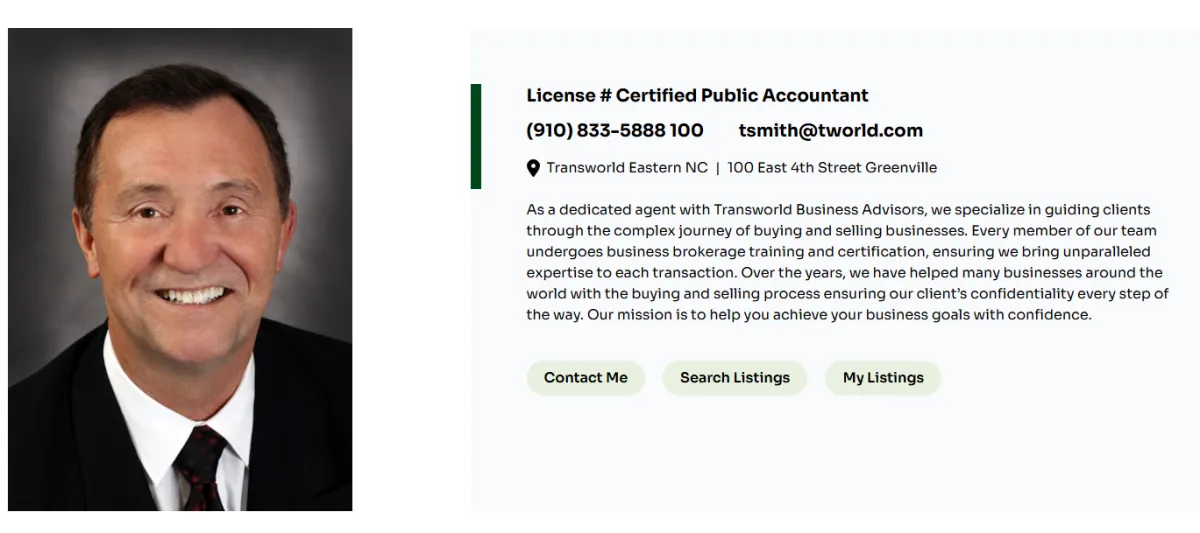 Terry, a seasoned Certified Public Accountant (CPA), has joined forces with Transworld Business Advisors of ENC, creating a powerhouse partnership within the #1 brokerage company in America. Terry brings to the table not only his exceptional accounting skills but also his keen expertise as a broker. With his valuable broker license in full swing, he's ready to guide you through the intricate process of buying or selling businesses with precision and ease. Whether you're an entrepreneur looking to acquire a new venture or a business owner prepared to pass on your legacy, Terry's merge with Transworld Business Advisors ensures you have top-tier support every step of the way, as Transworld Business Advisors is the world leader in the marketing and sales of businesses and franchises.